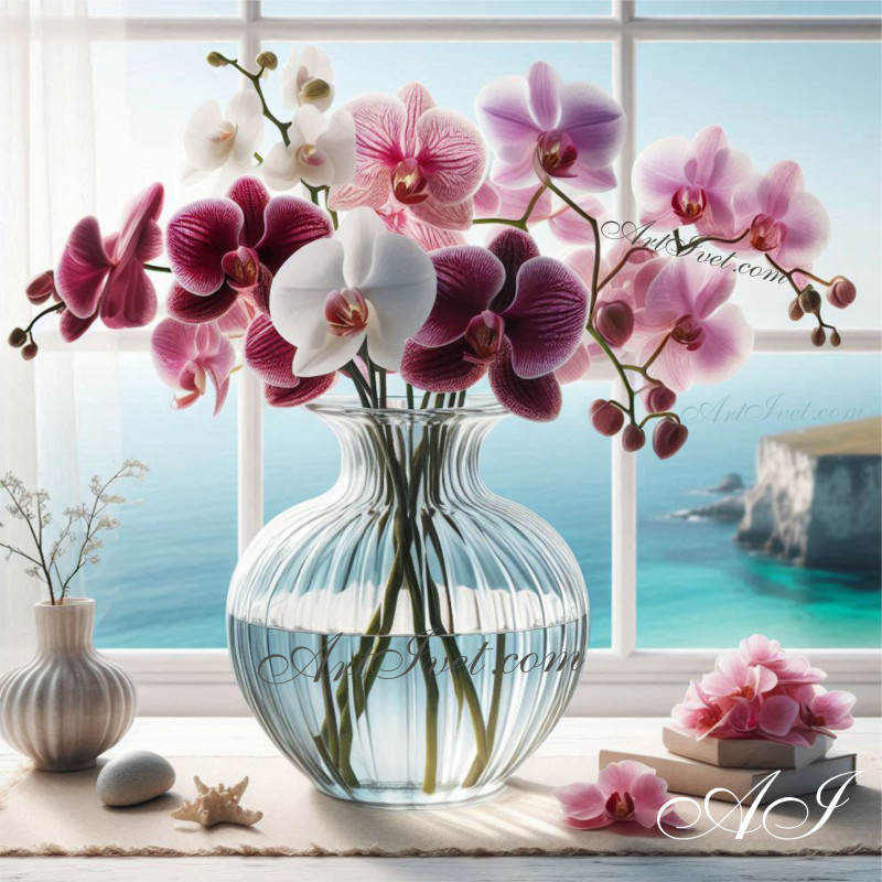 Рисуване по номера - ОРХИДЕИ В КРЪГЛА ВАЗА 40х40 см.