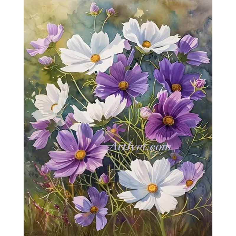 Рисуване по номера - КРАСИВИ ЦВЕТЯ В ЛИЛАВО И БЯЛО
