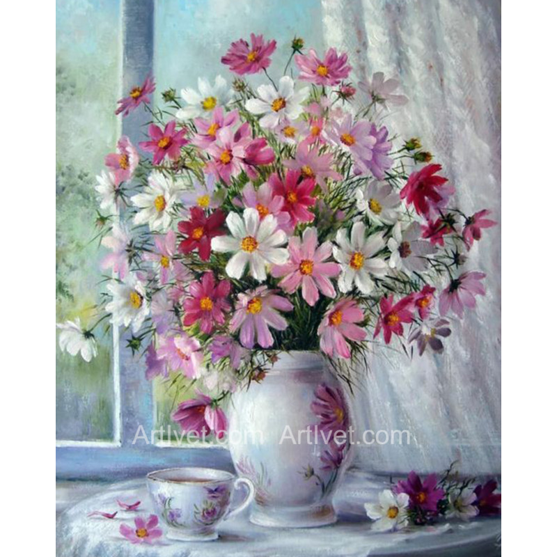 Рисуване по номера - НЕЖЕН БУКЕТ В РОЗОВО В БЯЛА ВАЗА