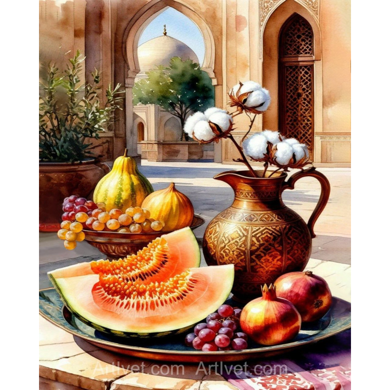 Рисуване по номера - НАТЮРМОРТ С ПЛОДОВЕ И ПАМУК В МЕДНИ СЪДОВЕ
