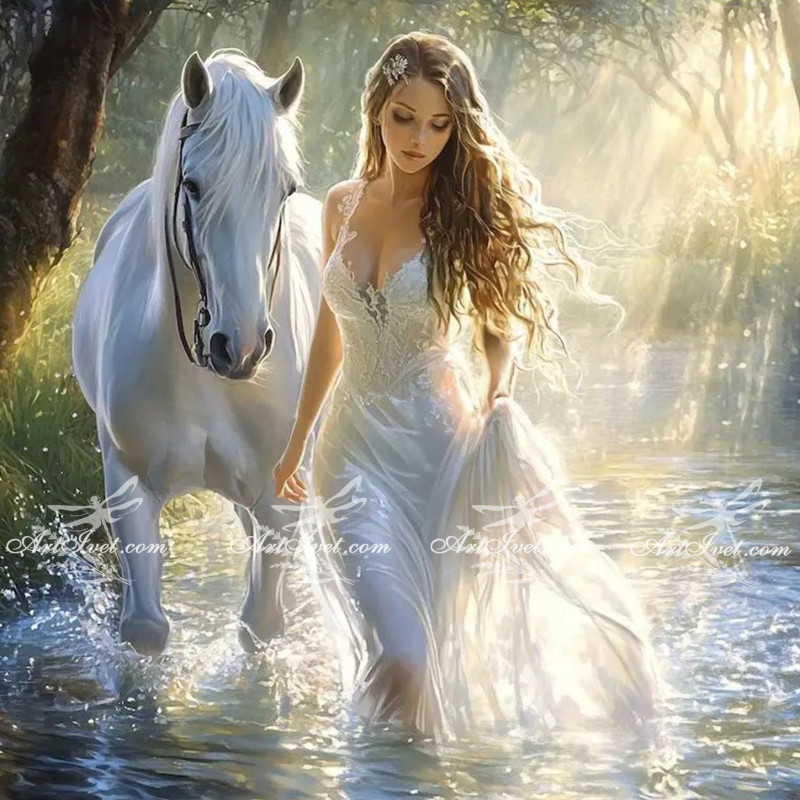 Рисуване по номера - ДВАМА В БЯЛО - ЖЕНА И КОН - 40х40 см.