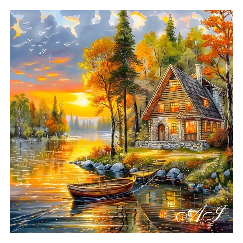 Рисуване по номера -ЗЛАТЕН ЗАЛЕЗ НАД КЪЩАТА НА РИБАРЯ40х40 см.