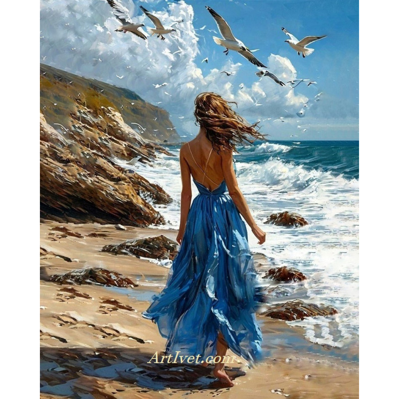 Рисуване по номера - ДАМА СЪС СИНЯ РОКЛЯ НА СКАЛИСТИЯ БРЯГ
