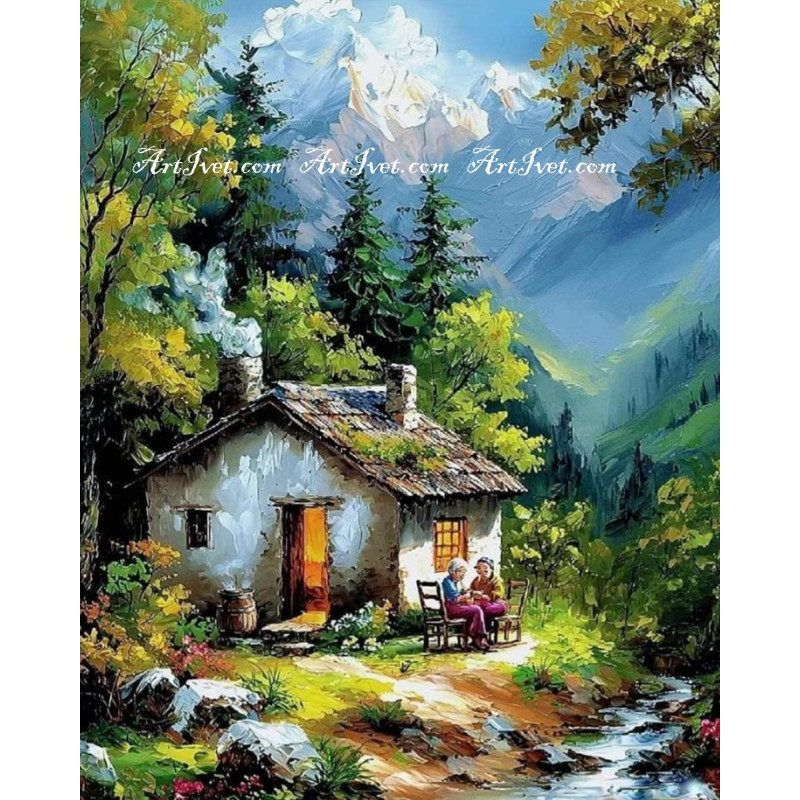 Рисуване по номера - В ПОДНОЖИЕТО НА ПЛАНИНАТА МАЛКА КЪЩИЧКА СЕ ГУШИ