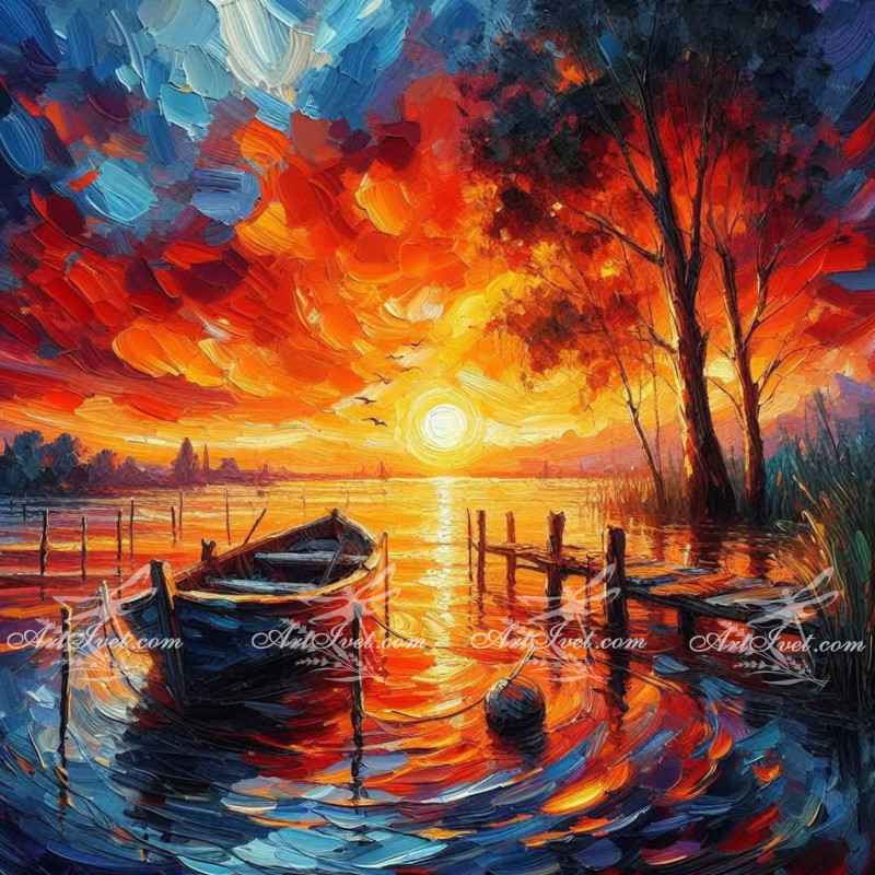 Рисуване по номера - ПЛАМЕНЕН ЗАЛЕЗ НАД ПРИСТАНА ЗА ЛОДКИ 40х40 см.
