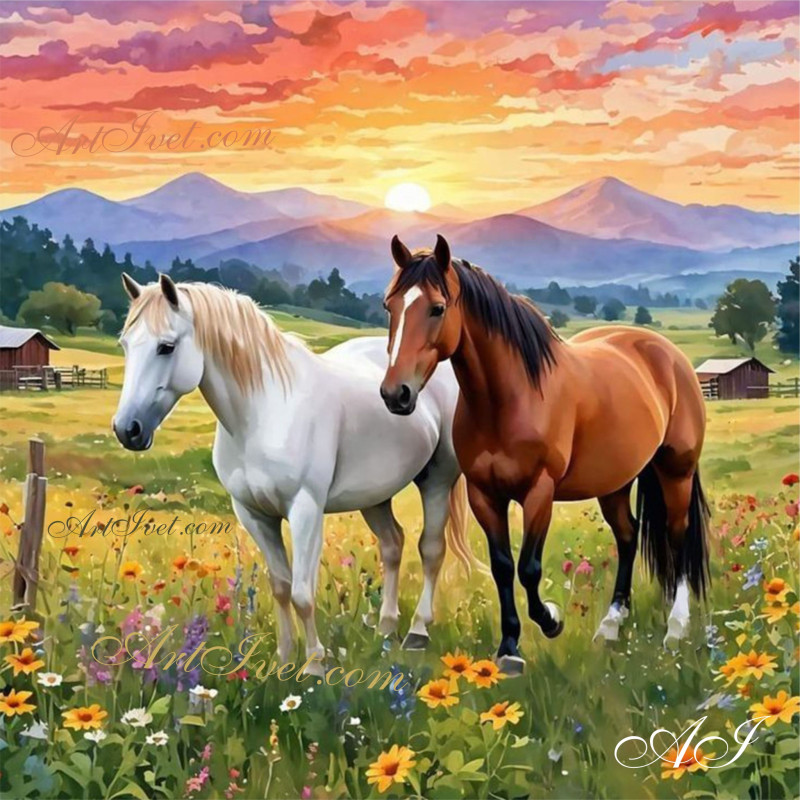 Рисуване по номера - ДВА КОНЯ СРЕД ПОЛЕТО 40х40 см.
